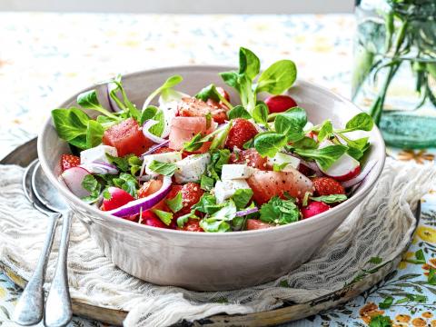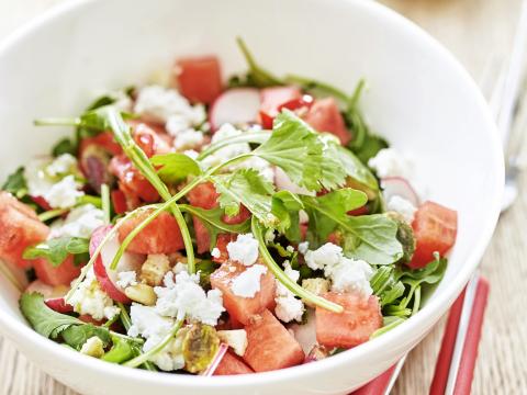 Vous cherchez une idée pour un lunch sur le pouce? Misez tout sur une salade à base dudit fruit et de fromage (feta, mozzarella, au choix…). Pour la satiété, ajoutez des légumineuses ou des céréales complètes.