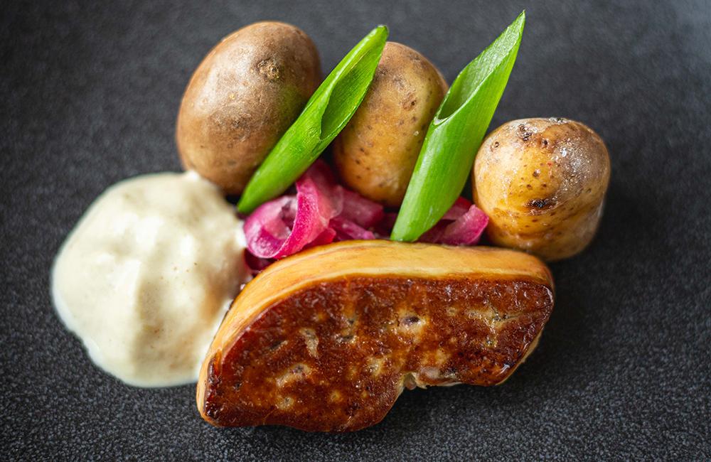 ENTREE – Pomme de terre grenaille cuites au sel, espuma de Foie Gras, confit d'oignons aux baies roses à base de lobe cru de Foie Gras de canard