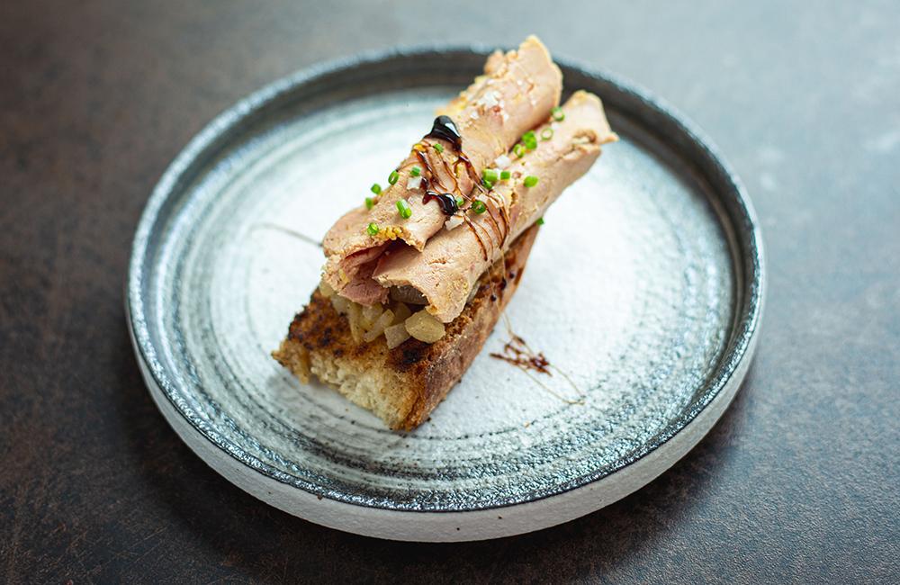 APERO/ LUNCH /PLAT – Tartine de terrine de Foie Gras, crème de raifort, pickles d'oignons rouge et jeunes pousses à base de terrine de Foie Gras de canard