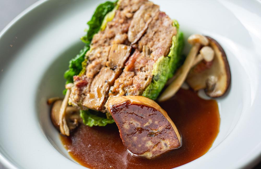 PLAT – Choux frisé farcis au Foie Gras et champignons, jus de viandes fumé à base de Foie Gras de canard cru puis poêlé