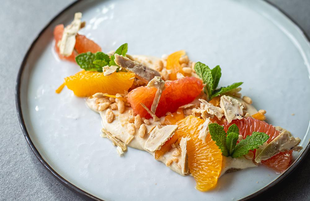 DESSERT – Mousse chantilly de Foie Gras, praliné noisette, riz soufflé et déclinaison d'agrumes à base de terrine de Foie Gras de canard