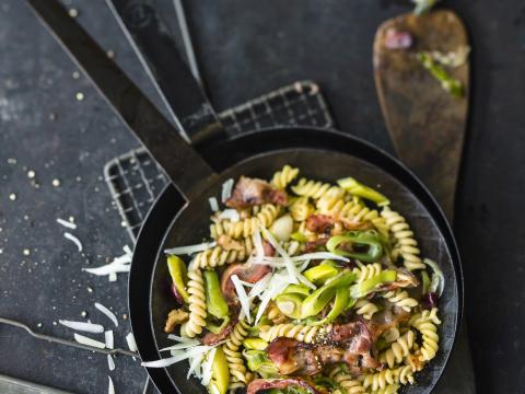 Spirellis aux poireaux et au bacon, canneberges séchées