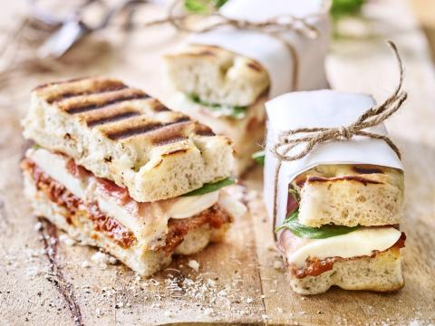 Focaccia façon croque-monsieur, tapenade d'olives, mozzarella