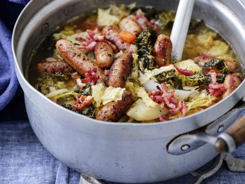 Hochepot aux chipolatas, bouillon de légumes