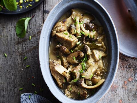 Vegan friendly: cocotte de seitan, bimis et champignons