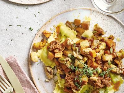Pizza en pâte aux amandes et aux légumes d’hiver