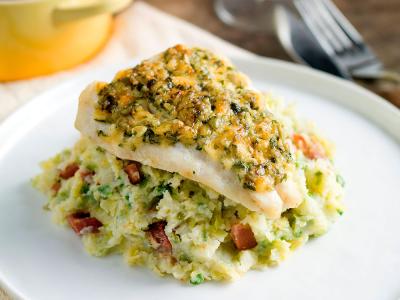 Aiglefin en croûte de persil, stoemp aux choux de Bruxelles
