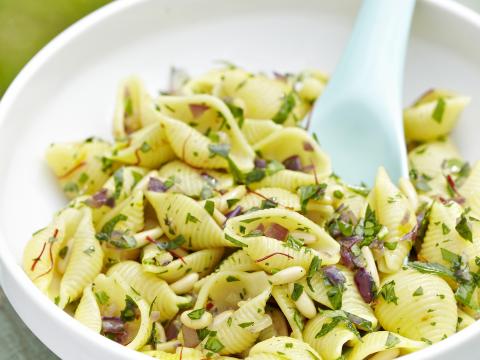Epluchez et hachez l'ail. Mélangez-le avec le jus de citron et l'huile d'olive (quantité selon vos préférences). Salez, poivrez. Versez la vinaigrette sur les pâtes. Décorez avec une pincée de paprika.