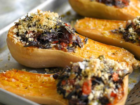 Sortez les butternuts du four, remplissez les cavités avec le mélange de riz, répartissez les noix et prolongez la cuisson, 20 min. Servez avec le reste du riz.