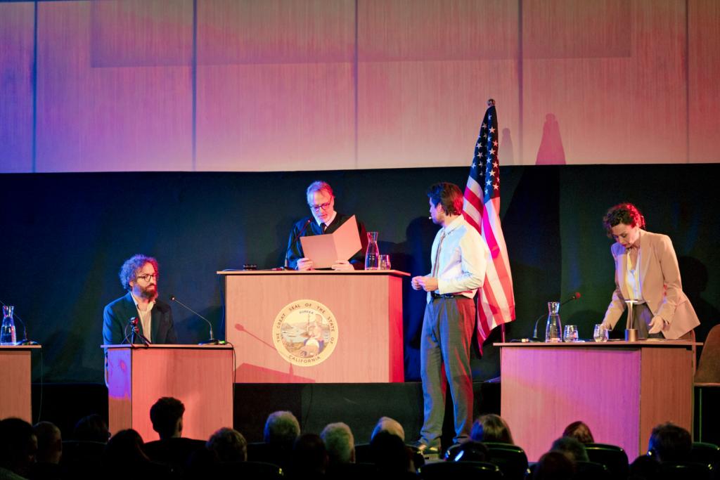 “À plusieurs moments de la soirée, le juge interrompt les débats: ‘Le jury doit se prononcer.’ Quelle question poser à l’accusé? Quelle preuve examiner? À nous de voter, via notre smartphone. Les votes sont comptabilisés en temps réel – dispositif ingénieux puisque nos décisions collectives influencent le fil de la représentation. Et puis vient le moment du vote final. L’accusé va-t-il écoper de 10 ans de prison, pour homicide involontaire? Là, fini le silence dans la salle, les débats prennent vie entre les participants: ‘Tu vas le condamner, toi?’, ‘Tu trouves que la machine a une intention?’, ‘Mais c’est lui qui l’a créée, il doit payer’, ‘Si c’était ton père qui avait été victime, tu penserais pareil?’…